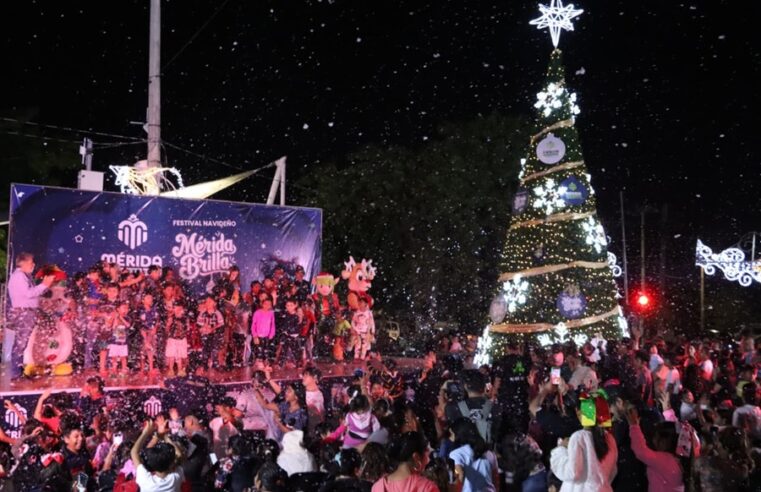 MERIDA, Yucatán.- El sur de Mérida ya brilla con el sexto árbol navideño monumental que la presidenta municipal Cecilia Patrón Laviada encendió acompañada de vecinas y vecinos de la zona.