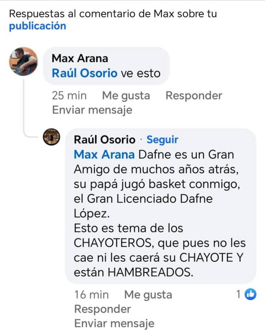 «Dafne López es un gran amigo de muchos años atrás…Su papá jugo basket conmigo, el Gran Licenciado Dafne López» -asi respondió Raúl Osorio a un internauta que lo etiquetó en una publicación que revelaba que el asesor Dafne lo tenía en la mira a él y a Federica Quijano