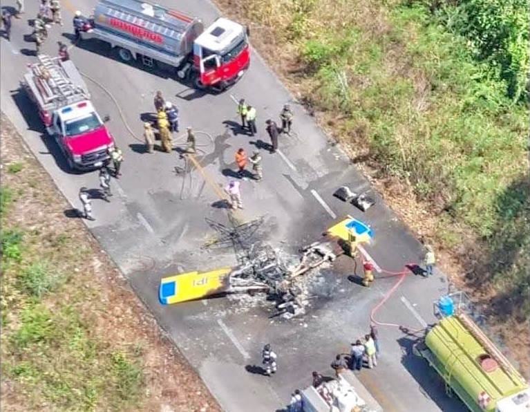Según informes preliminares, la avioneta cayó en la carretera Valladolid-Chichén Itzá y se incendió inmediatamente después del impacto.