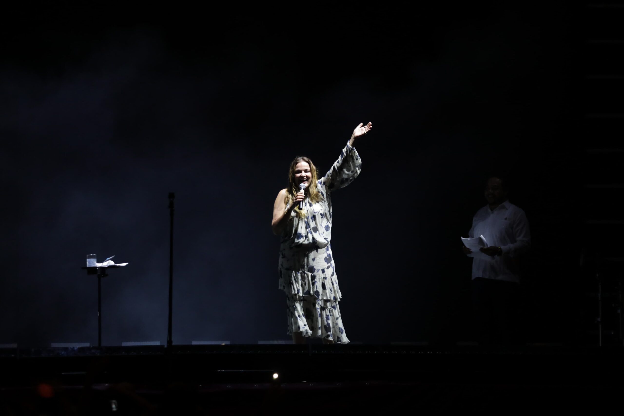 En un ambiente eléctrico, el trío subió al escenario saludando a la multitud que gritaba de emoción.