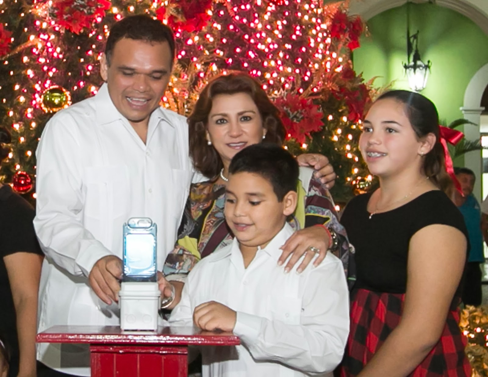 Acompañado de la Presidenta estatal del Sistema para el Desarrollo Integral de la Familia, Sarita Blancarte de Zapata, y sus hijos Rolando y Monserrat, el mandatario accionó el botón para iluminar el árbol navideño que en esta ocasión tiene cinco metros de altura y fue adornado con 40 esferas y 35 series de luces multicolores.