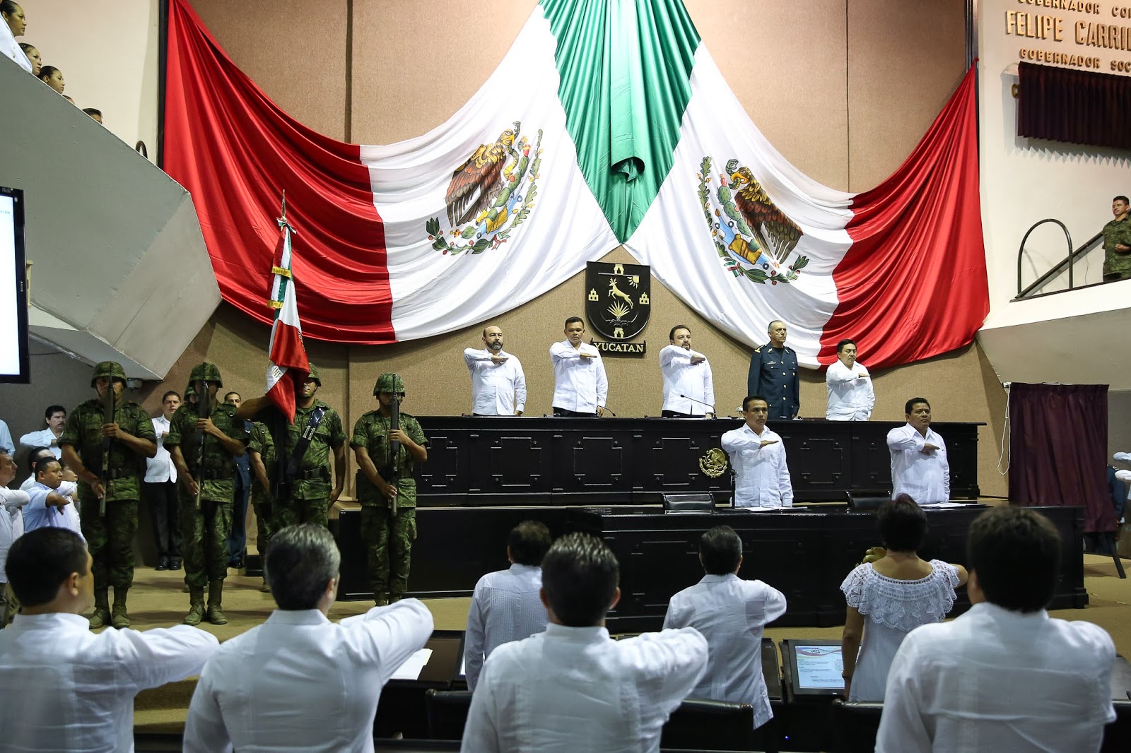 En sesión solemne, el Gobernador Rolando Zapata Bello y el titular de la Secretaría de la Defensa Nacional (SEDENA), Salvador Cienfuegos Zepeda, develaron la placa conmemorativa del centenario de la creación del Ejercito Mexicano, en este sitio donde también se encuentran escritos los nombres de los beneméritos del estado, Salvador Alvarado, Eligio Ancona y Manuel Crescencio Rejón, así como de los ex Gobernadores Manuel Cepeda Peraza y Felipe Carrillo Puerto.