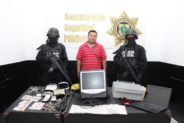 Elementos de la SSP detuvieron a Aristeo López Cortés de 38 años de edad y originario del Distrito Federal, por haber sustraído varios artículos en predios del fraccionamiento Las Américas, Francisco de Montejo y San Antonio Cinta.