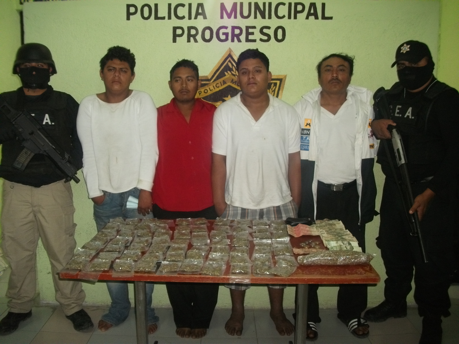 Elementos de la Policía de Progreso detuvieron a cuatro sujetos por comercialización de droga.