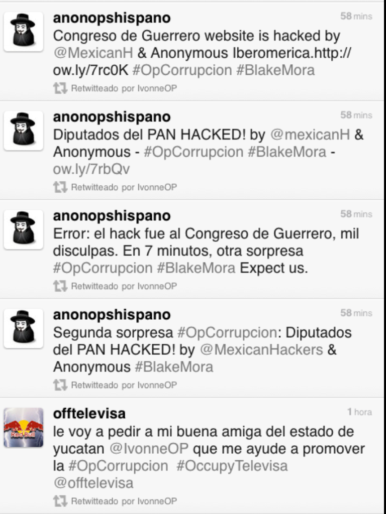 En su cuenta hackeada, la gobernadora retuiteó mensajes contra Televisa, y otros «tuits» que informaban de que habían sido hackeadas los portales de los congresos de Guerrero, Nayarit, Queretaro, entre otros