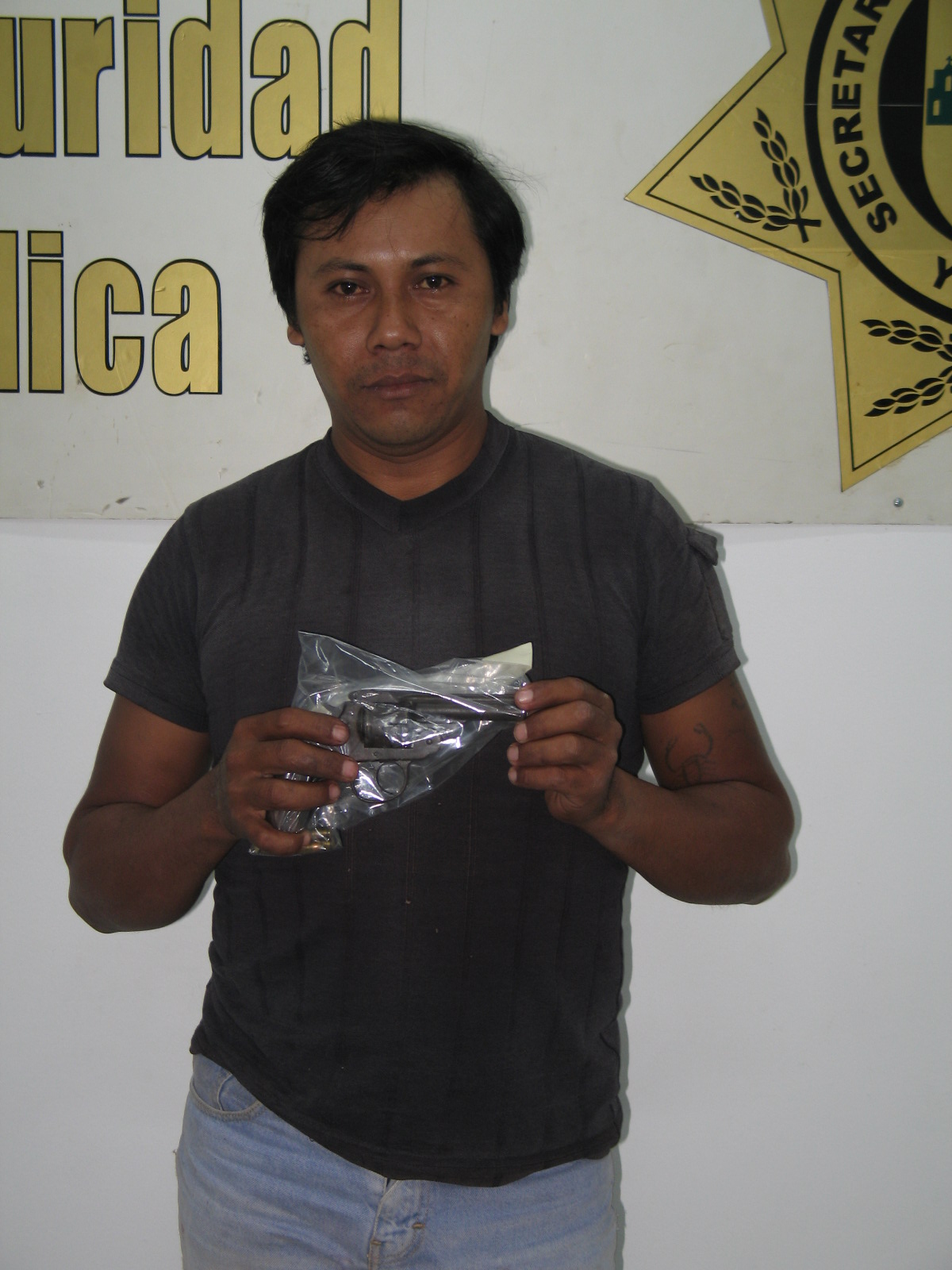 Al tener conocimiento del hecho, los elementos de la SSP lo ubicaron en la calle 26 por 51 de la colonia Yoxchenkax portando en arma en su citntura, entregó el revólver calibre .380 automática marca Águila sin matrícula y con 5 cartuchos útiles.