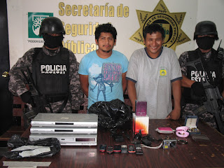 José Felipe Caraveo Caraveo y José Luis López Guitérrez, ambos tabasqueños y de 28 años de edad. fueron detenidos por elementos de la Secretaría de Seguridad Pública, por haberse apoderado de varios artículos de un predio del fraccionamiento Vergel.