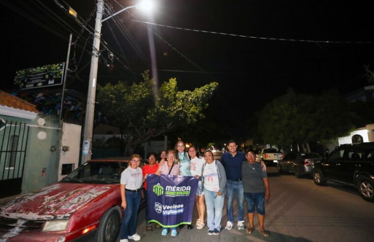 MÉRIDA, Yucatán.- Como parte del plan integral para modernizar los servicios públicos de Mérida, la presidenta municipal Cecilia Patrón Laviada supervisó la instalación de nuevas luminarias LED en el fraccionamiento